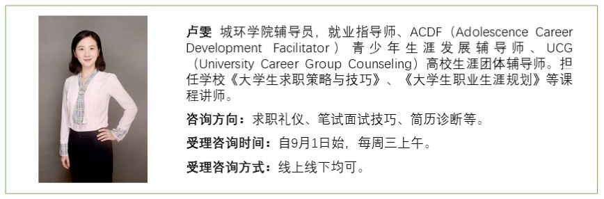 拟于2020年9月1日起面向在校学生(含研究生、全日制本科生)开展“一对一”生涯发展与求职就业个性化咨询服务。咨询的内容主要包括自我探索、目标定位、生涯管理、职业探索、职业选择、简历诊断、求职技巧,职前适应等方面。